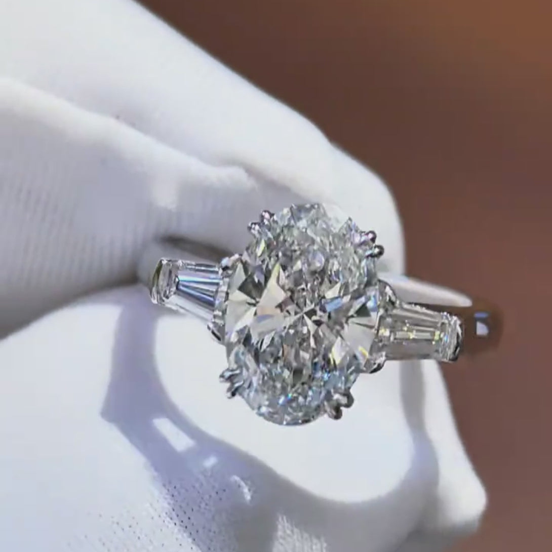 This three-stone lab-grown diamond ring centers on a luminous oval center stone, flanked by two sleek baguette-cut side diamonds (set in polished 14K or 18K gold). The soft curves of the oval pair with the crisp lines of the baguettes, balancing romance and modernity—perfect for office wear, evening events or everyday elegance. Grown sustainably with zero mining footprint, the diamonds match natural stones’ fire and clarity, making it a versatile choice for timeless luxury, heartfelt gifting and polished style.